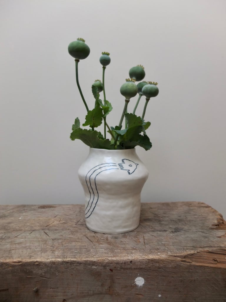 A large hand built vessel in beautiful bright porcelain, illustrated with flying birds and finished with a clear glaze.